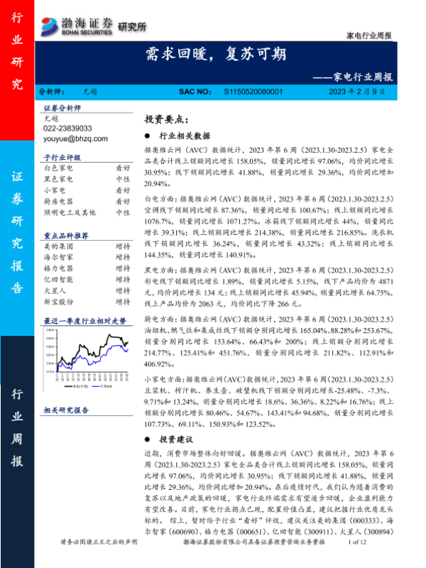 【渤海证券】【20230209】家电行业周报:需求回暖,复苏可期-12页