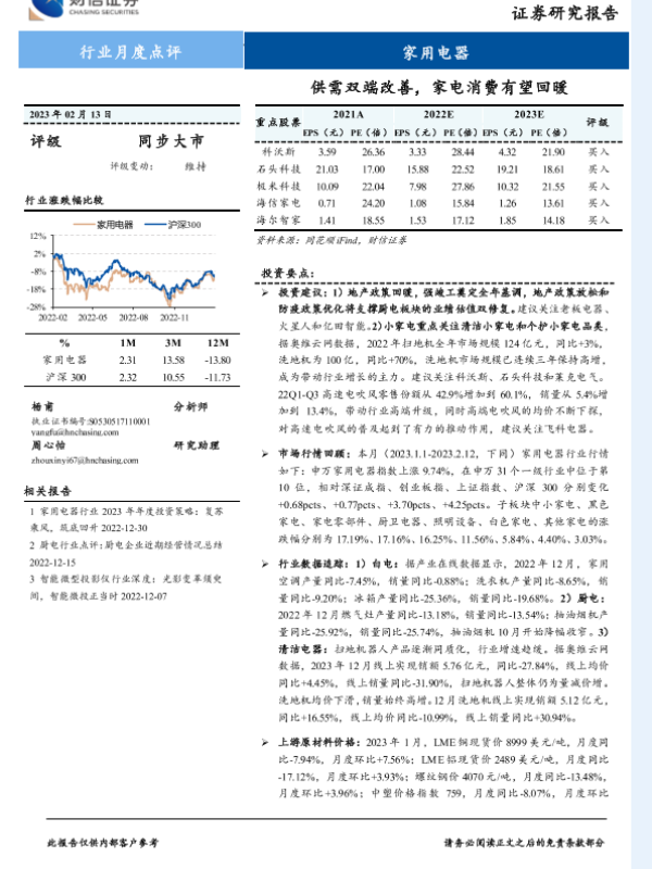 【财信证券】【20230213】20230213-财信证券-家用电器行业月度点评:供需双端改善,家电消费有望回暖-16页