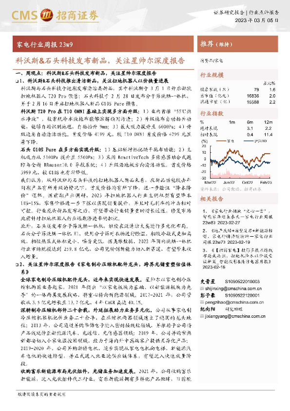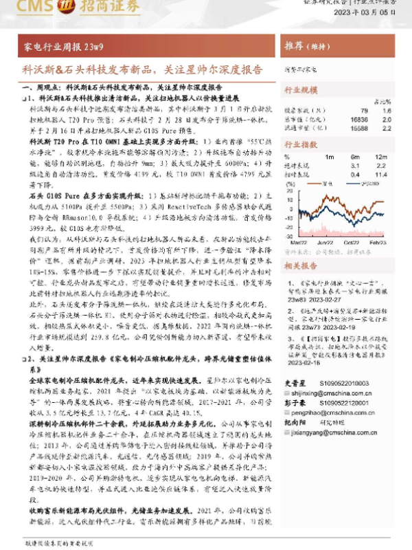 【海通证券】【20230305】家电行业周报23w9:科沃斯&石头科技发布新品,关注星帅尔深度报告-10页
