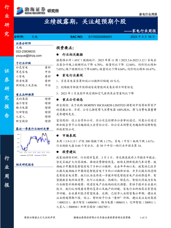 【渤海证券】【20230316】家电行业周报:业绩披露期,关注超预期个股-13页