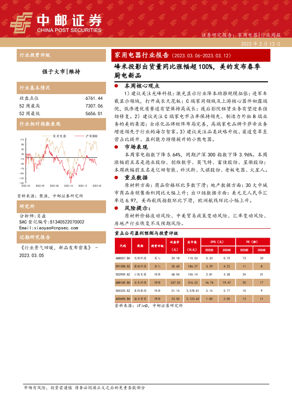 【中邮证券】【20230313】20230313-中邮证券-家用电器行业报告:峰米投影出货量同比涨幅超100%,美的发布春季厨电新品-13页