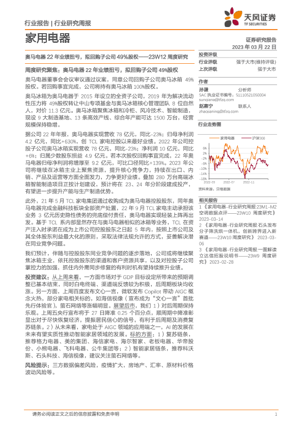 【天风证券】【20230322】家用电器23W12周度研究:奥马电器22年业绩扭亏,拟回购子公司49%股权-14页