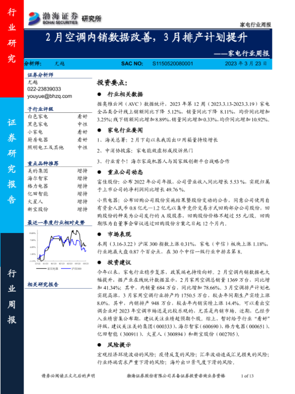【渤海证券】【20230323】家电行业周报:2月空调内销数据改善,3月排产计划提升-13页