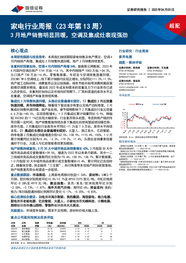【国信证券】【20230403】20230403-国信证券-家电行业周报(23年第13周):3月地产销售明显回暖,空调及集成灶表现强劲-16页