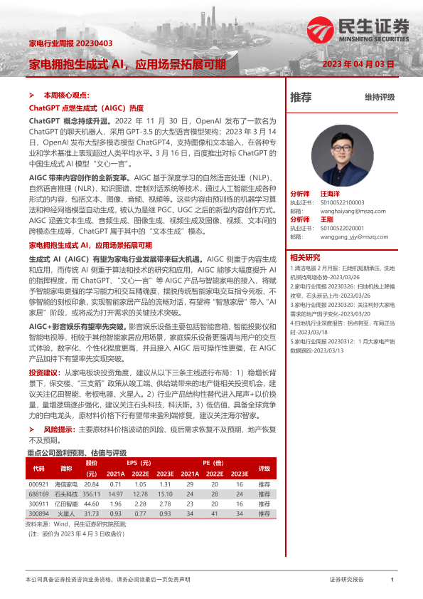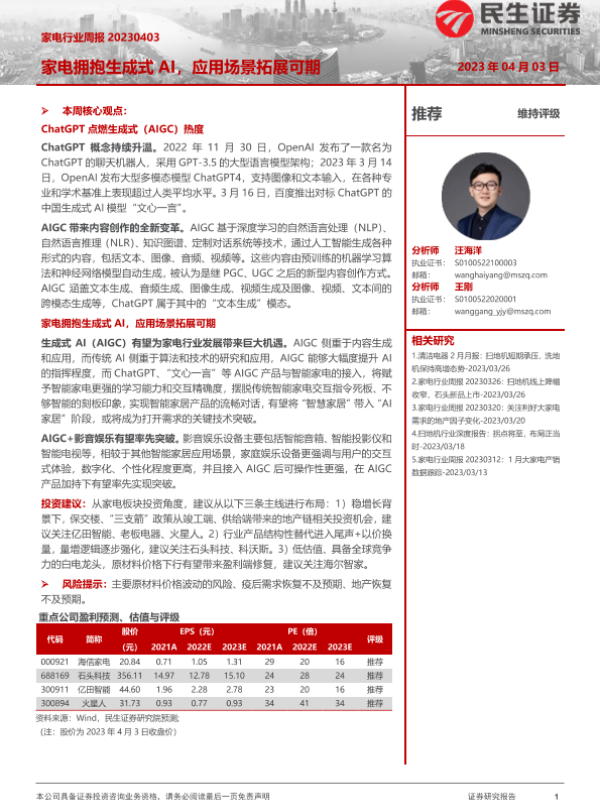 【民生证券】【20230403】家电行业周报:家电拥抱生成式AI,应用场景拓展可期-16页