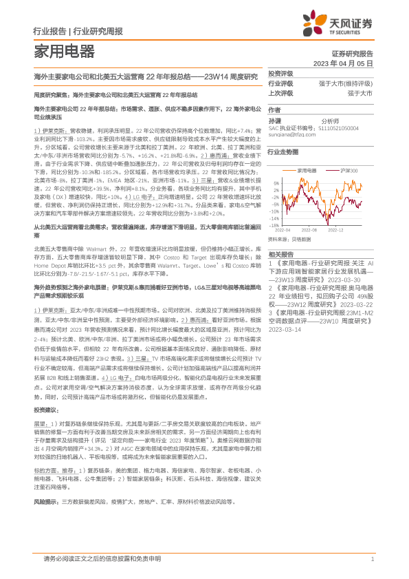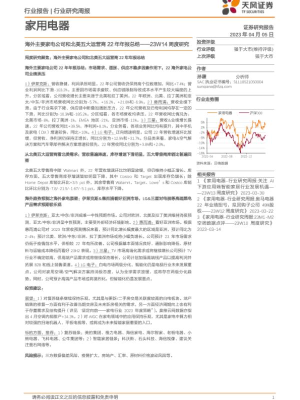 【天风证券】【20230405】家用电器行业研究周报:海外主要家电公司和北美五大运营商22年年报总结——23W14周度研究-14页