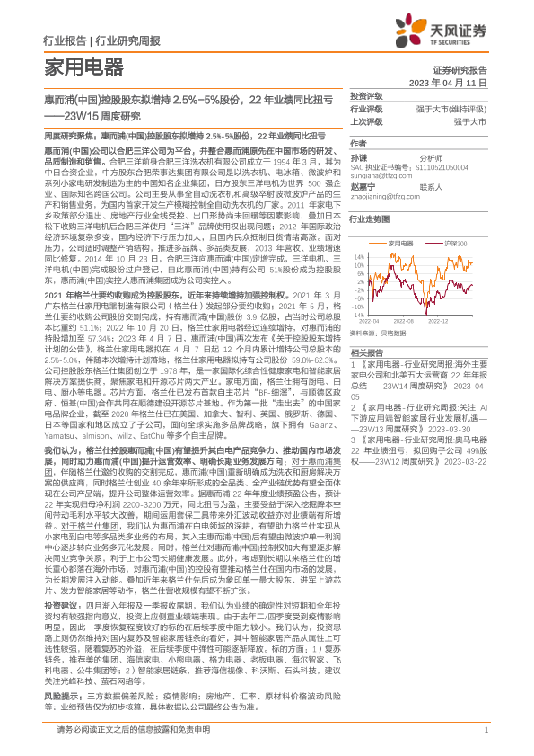 【天风证券】【20230411】家用电器23W15周度研究:惠而浦(中国)控股股东拟增持2.5%-5%股份,22年业绩同比扭亏-13页