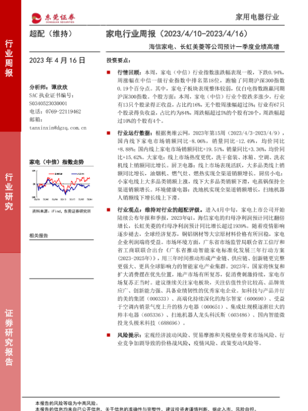 【东莞证券】【20230416】家电行业周报:海信家电、长虹美菱等公司预计一季度业绩高增-14页