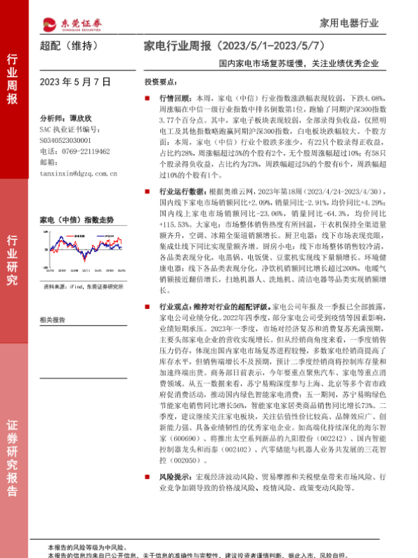【东莞证券】【20230507】20230507-东莞证券-家电行业周报:国内家电市场复苏缓慢,关注业绩优秀企业-15页