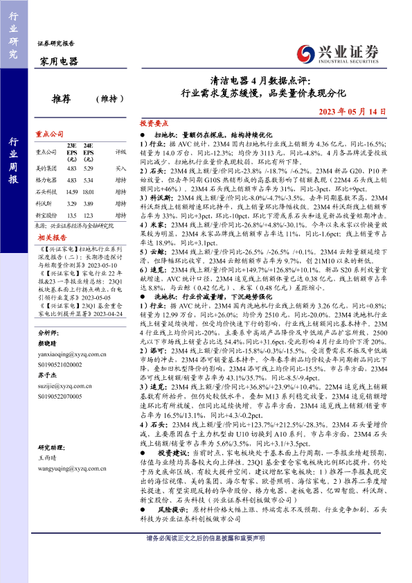 【兴业证券】【20230514】清洁电器4月数据点评:行业需求复苏缓慢,品类量价表现分化-10页