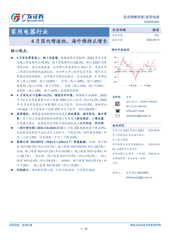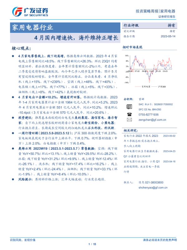 【广发证券】【20230514】20230514-广发证券-家用电器行业投资策略周报:4月国内增速快,海外维持正增长-15页