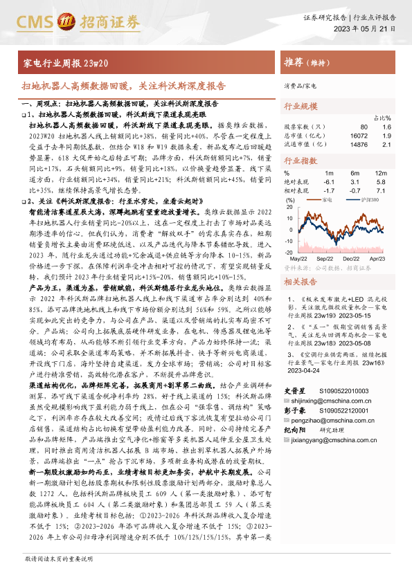 【海通证券】【20230521】20230521-招商证券-家电行业周报23w20:扫地机器人高频数据回暖,关注科沃斯深度报告-12页