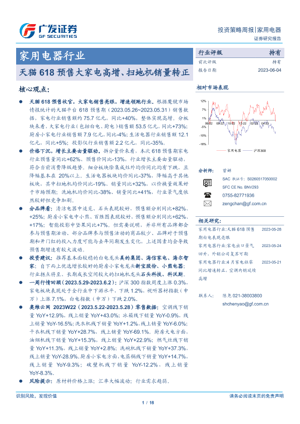 【广发证券】【20230604】20230604-广发证券-家用电器行业投资策略周报:天猫618预售大家电高增、扫地机销量转正-16页