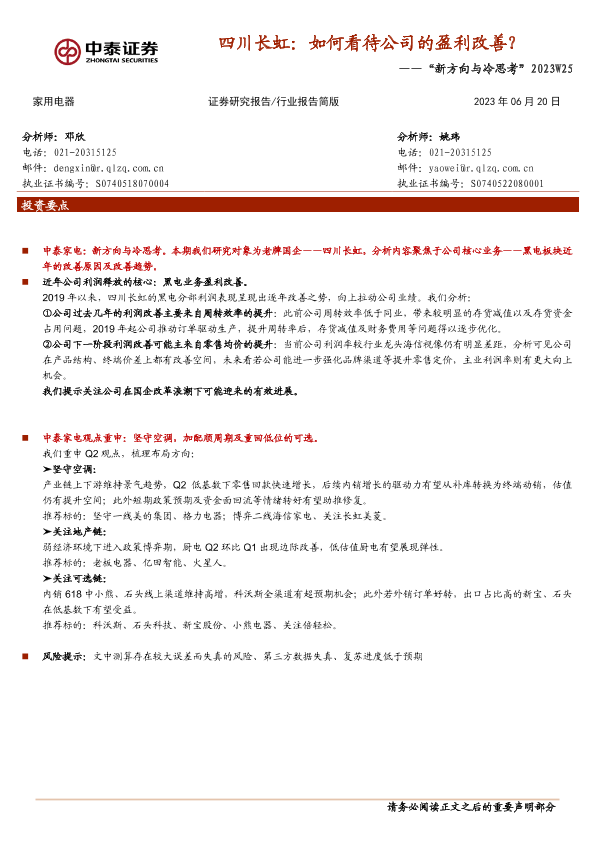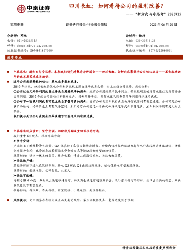 【中泰证券】【20230620】2023W25:四川长虹:如何看待公司的盈利改善?-10页