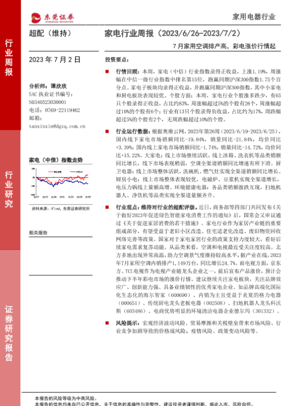 【东莞证券】【20230702】20230702-东莞证券-家电行业周报:7月家用空调排产高,彩电涨价行情起-15页