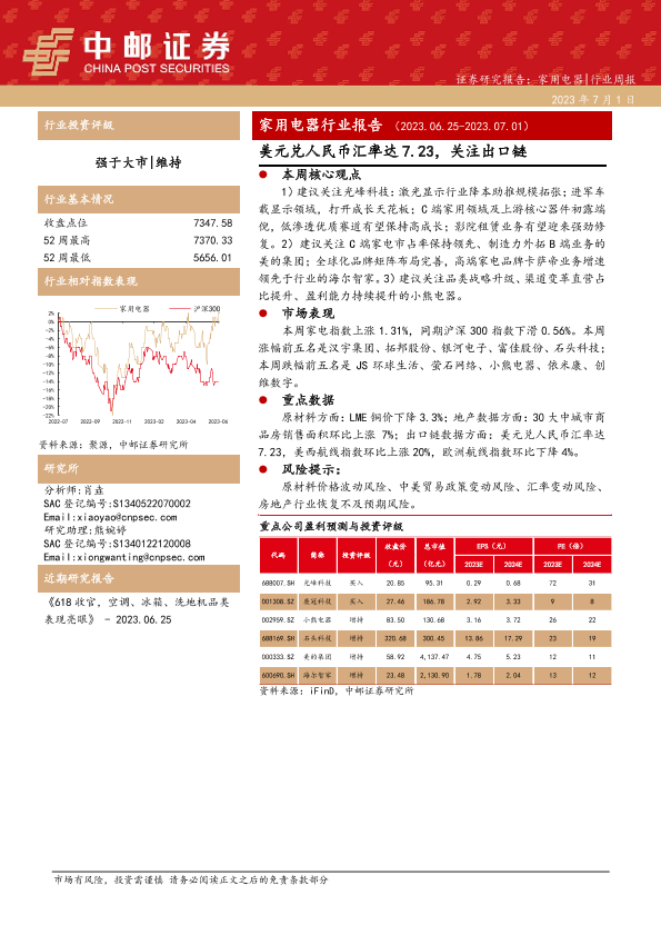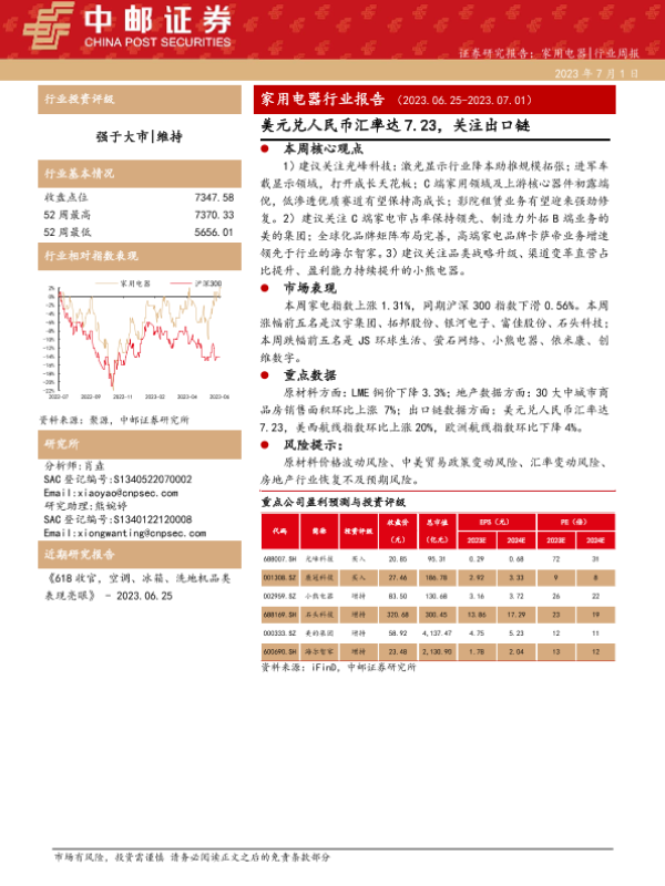 【中邮证券】【20230701】20230701-中邮证券-家用电器行业报告:美元兑人民币汇率达7.23,关注出口链-13页