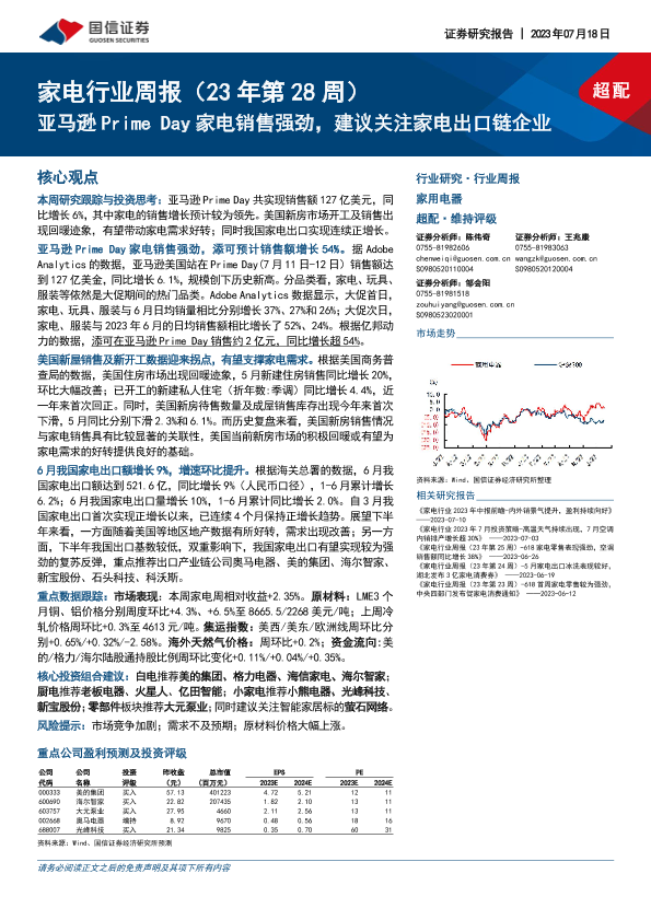 【国信证券】【20230718】20230718-国信证券-家电行业周报(23年第28周):亚马逊Prime Day家电销售强劲,建议关注家电出口链企业-15页