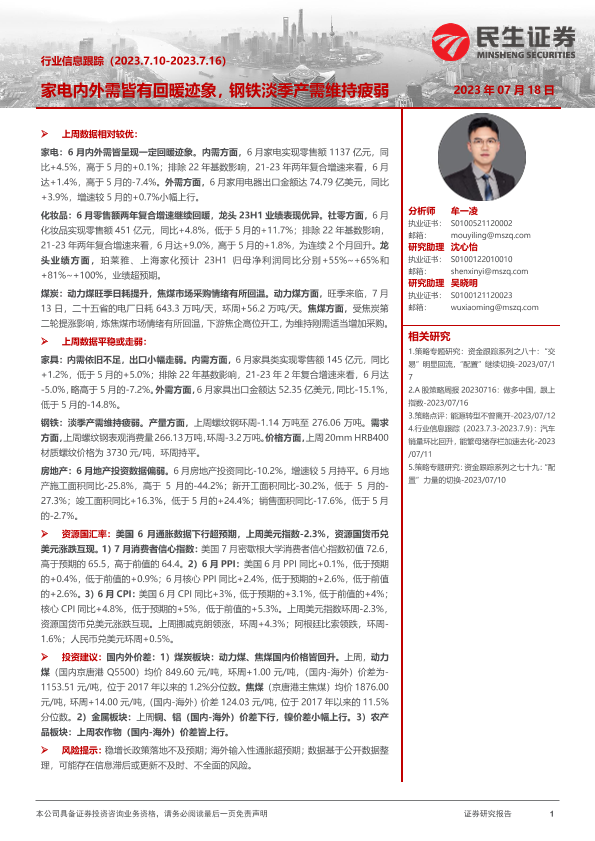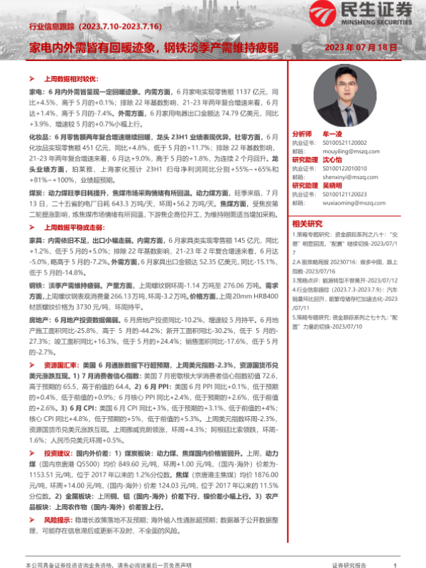 【民生证券】【20230718】20230718-民生证券-行业信息跟踪:家电内外需皆有回暖迹象,钢铁淡季产需维持疲弱-30页