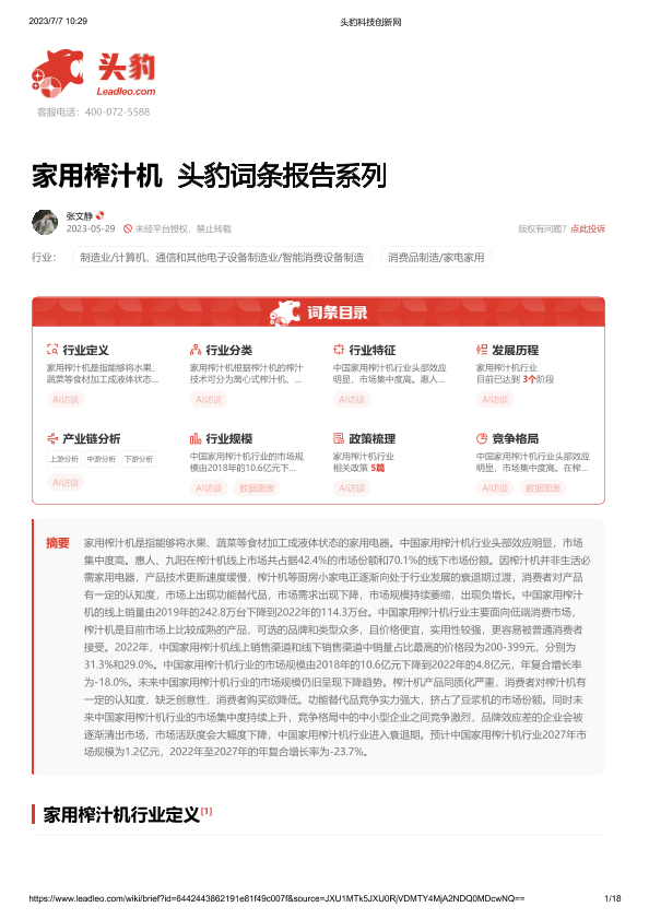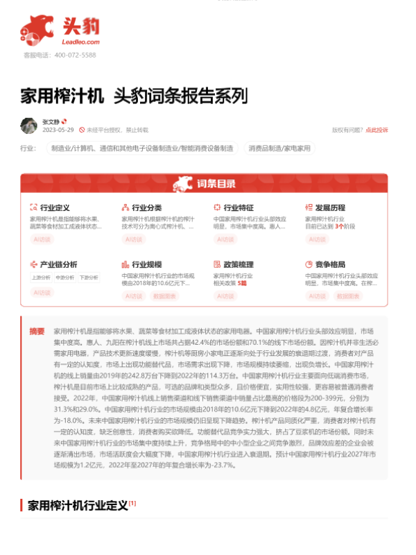 【头豹研究院】【20230725】家用榨汁机 头豹词条报告系列-18页
