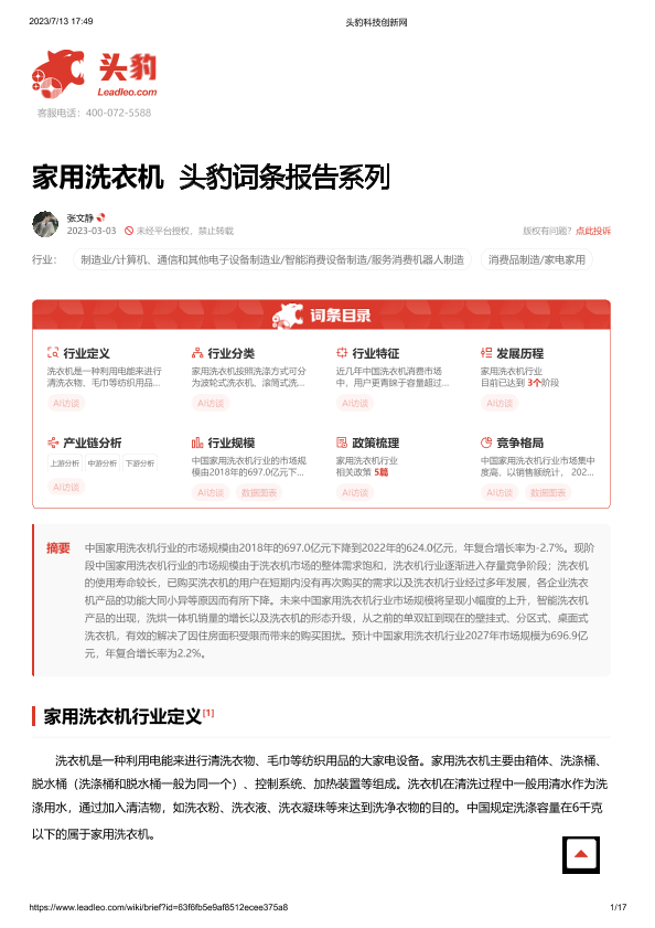 【头豹研究院】【20230728】家用洗衣机 头豹词条报告系列-17页