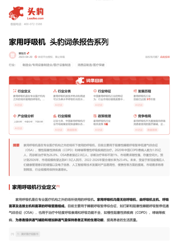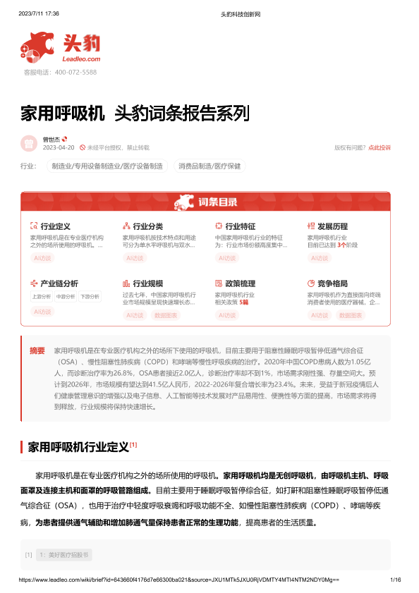 【头豹研究院】【20230711】家用呼吸机 头豹词条报告系列-16页