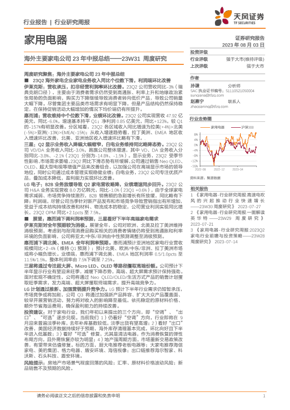 【天风证券】【20230803】家用电器23W31周度研究:海外主要家电公司23年中报总结-20页