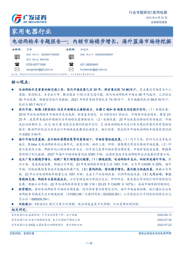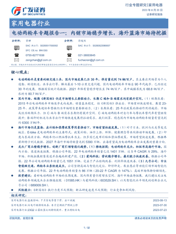 【广发证券】【20230820】家用电器行业电动两轮车专题报告一:内销市场稳步增长,海外蓝海市场待挖掘-32页