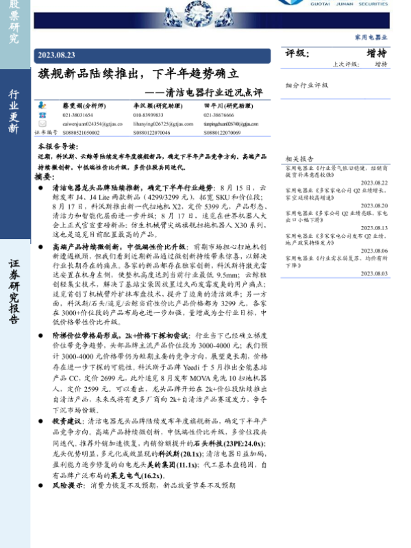 【国泰君安证券】【20230823】清洁电器行业近况点评:旗舰新品陆续推出,下半年趋势确立-12页