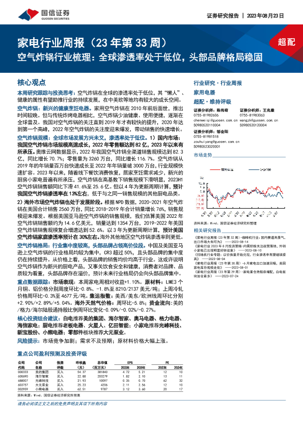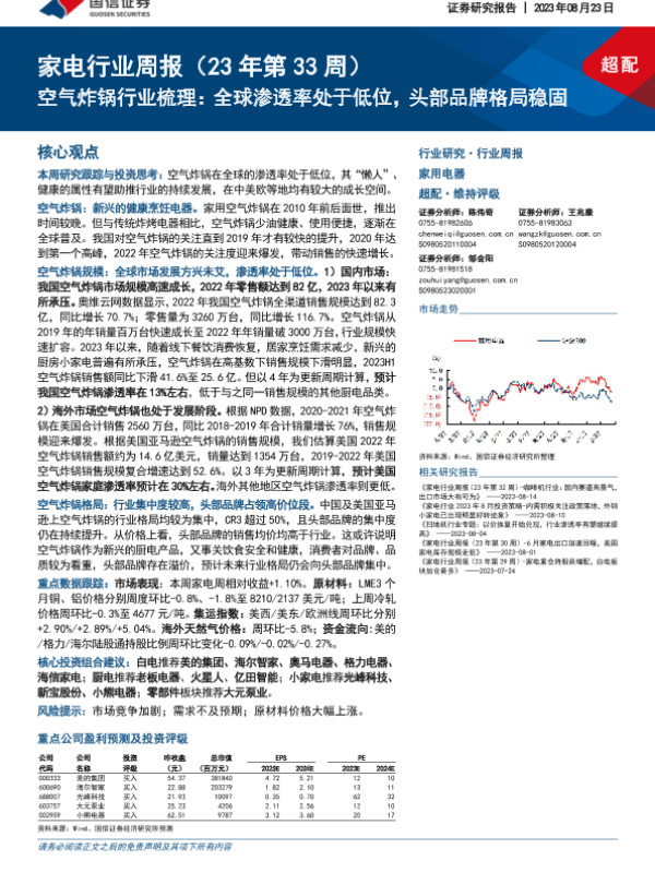 【国信证券】【20230823】家电行业周报(23年第33周):空气炸锅行业梳理:全球渗透率处于低位,头部品牌格局稳固-16页