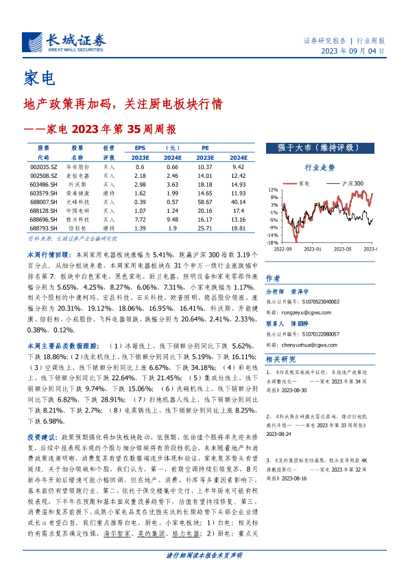【长城证券】【20230904】家电2023年第35周周报:地产政策再加码,关注厨电板块行情-30页