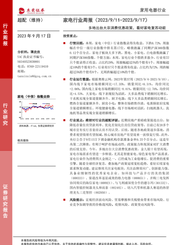 【东莞证券】【20230917】家电行业周报:多地出台大宗消费优惠政策,看好家电复苏动能-15页