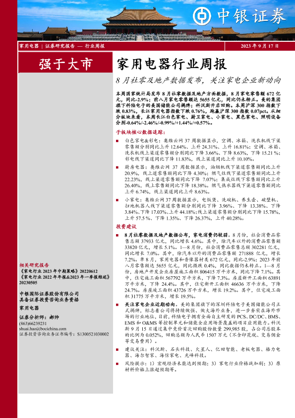 【中银证券】【20230917】20230917-中银证券-家用电器行业周报:8月社零及地产数据发布,关注家电企业新动向-24页