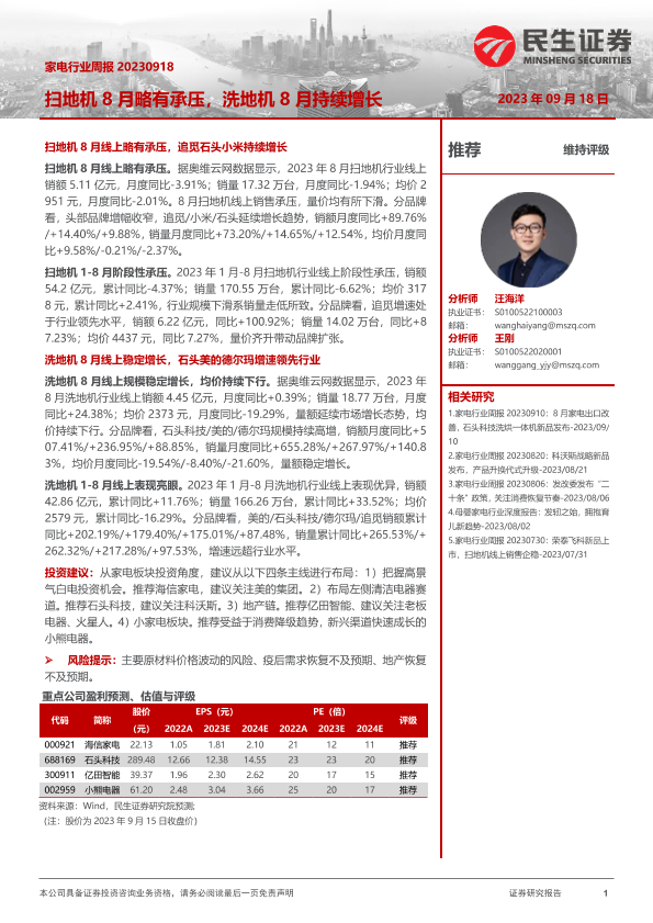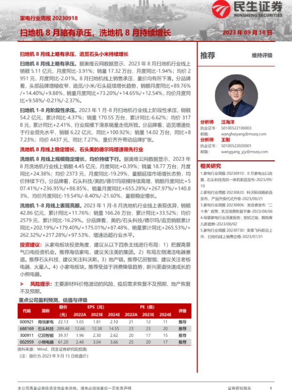 【民生证券】【20230918】家电行业周报:扫地机8月略有承压,洗地机8月持续增长-14页