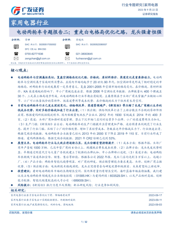 【广发证券】【20230922】20230922-广发证券-电动两轮车专题报告二:重走白电格局优化之路,龙头强者恒强-32页