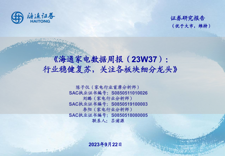 【海通证券】【20230922】海通家电数据周报(23W37):行业稳健复苏,关注各板块细分龙头-17页