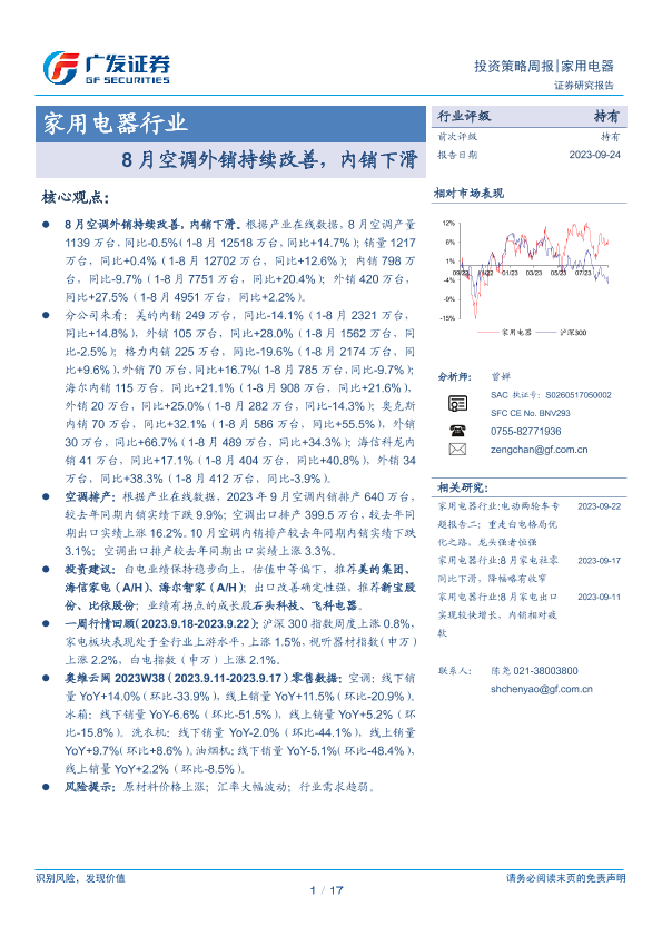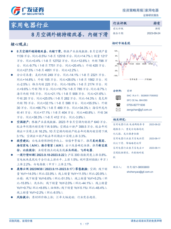 【广发证券】【20230924】20230924-广发证券-家用电器行业周报:8月空调外销持续改善,内销下滑-17页