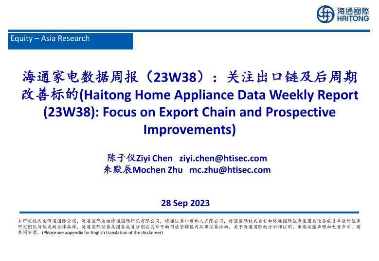 【海通国际】【20230928】海通家电数据周报:关注出口链及后周期改善标的-32页