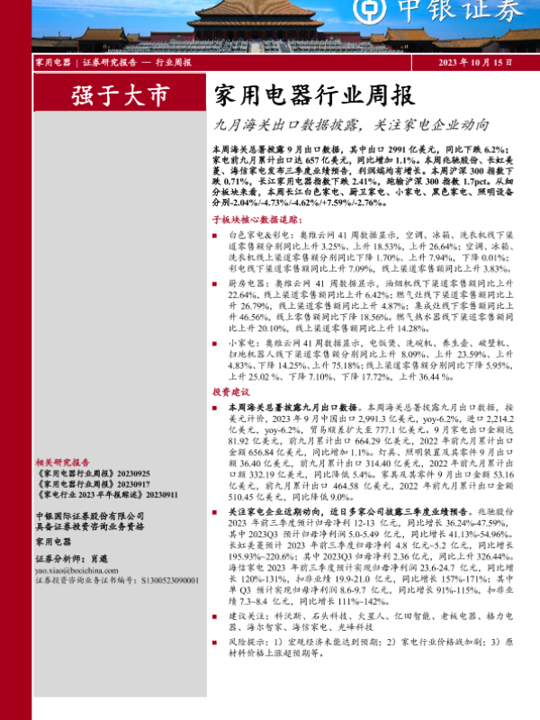 【中银证券】【20231015】家用电器行业周报:九月海关出口数据披露,关注家电企业动向-25页