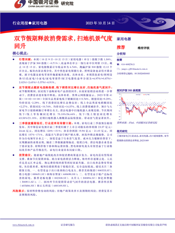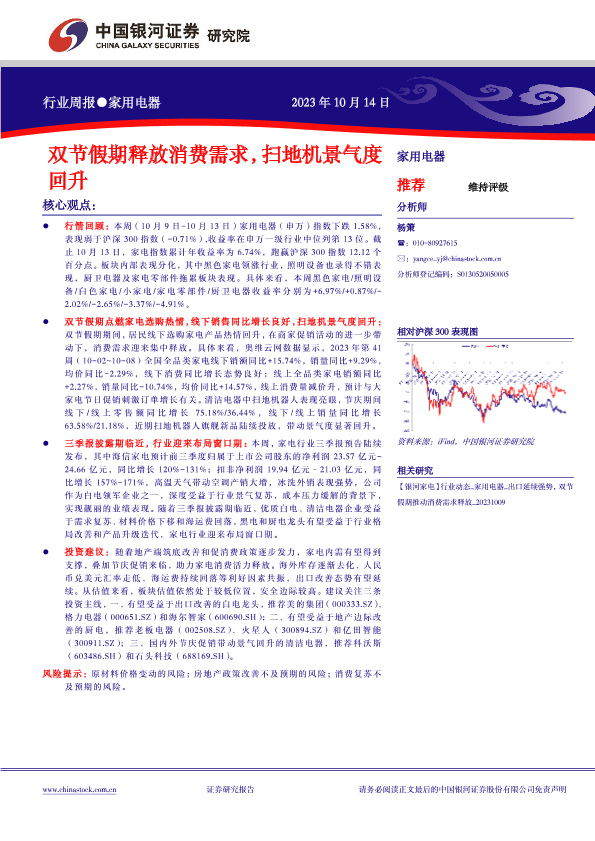 【银河证券】【20231015】20231015-中国银河-家用电器行业周报:双节假期释放消费需求,扫地机景气度回升-13页