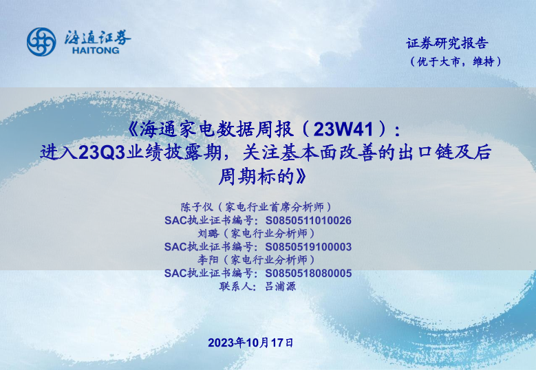 【海通证券】【20231017】海通家电数据周报(23W41):进入23Q3业绩披露期,关注基本面改善的出口链及后周期标的-17页