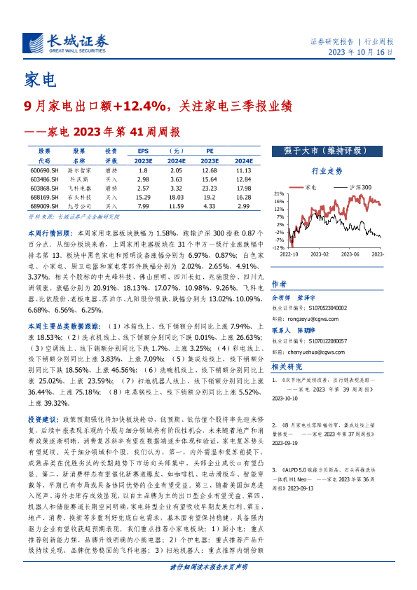 【长城证券】【20231016】家电2023年第41周周报:9月家电出口额+12.4%,关注家电三季报业绩-29页