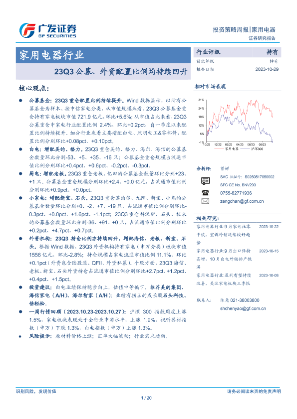 【广发证券】【20231029】家用电器行业:23Q3公募、外资配置比例均持续回升-20页