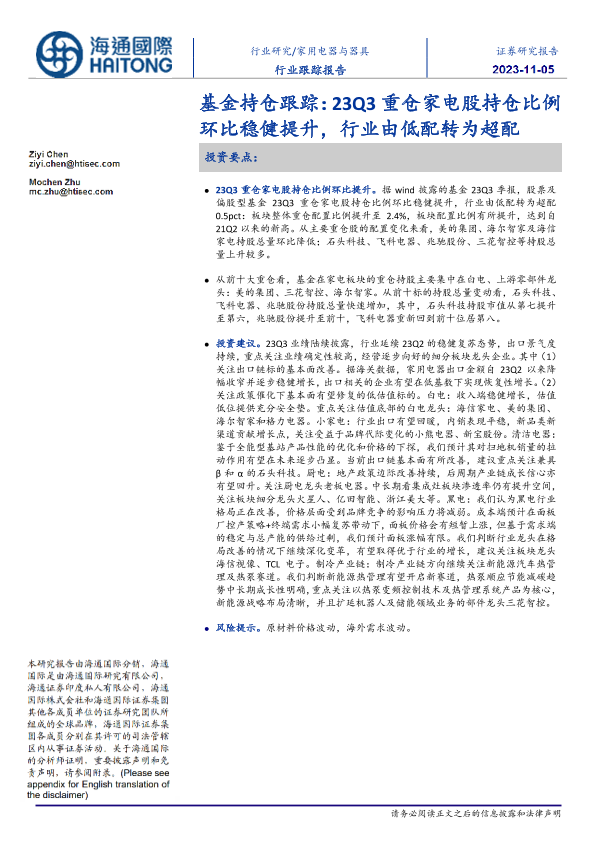 【海通国际】【20231103】23Q3重仓家电股持仓比例环比稳健提升,行业由低配转为超配-10页