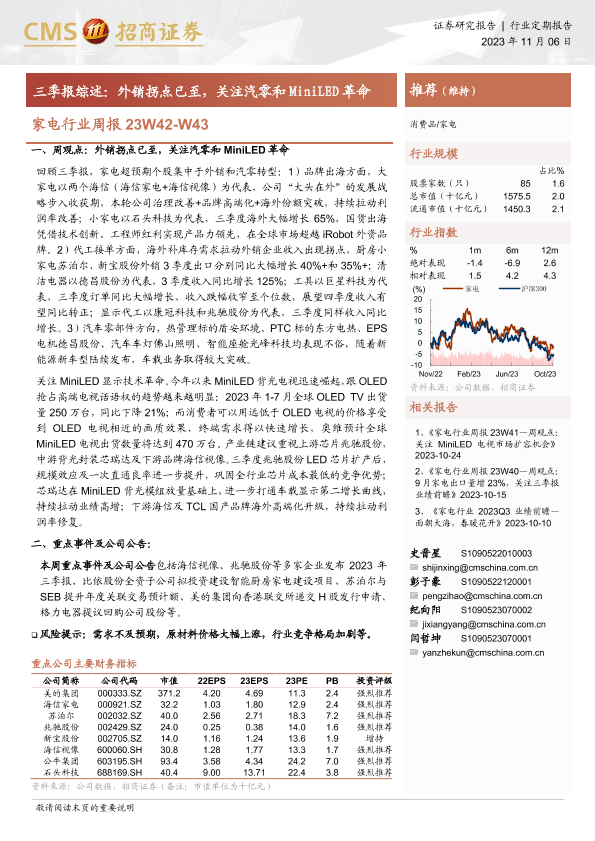 【海通证券】【20231106】家电行业周报23W42-W43:三季报综述:外销拐点已至,关注汽零和MiniLED革命-13页