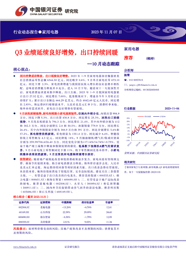 【银河证券】【20231107】20231107-中国银河-家用电器10月动态跟踪:Q3业绩延续良好增势,出口持续回暖-19页