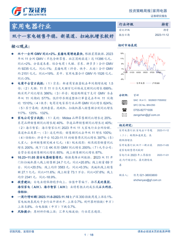 【广发证券】【20231112】20231112-广发证券-家用电器行业投资策略周报:双十一家电销售平稳,新渠道、扫地机增长较好-18页