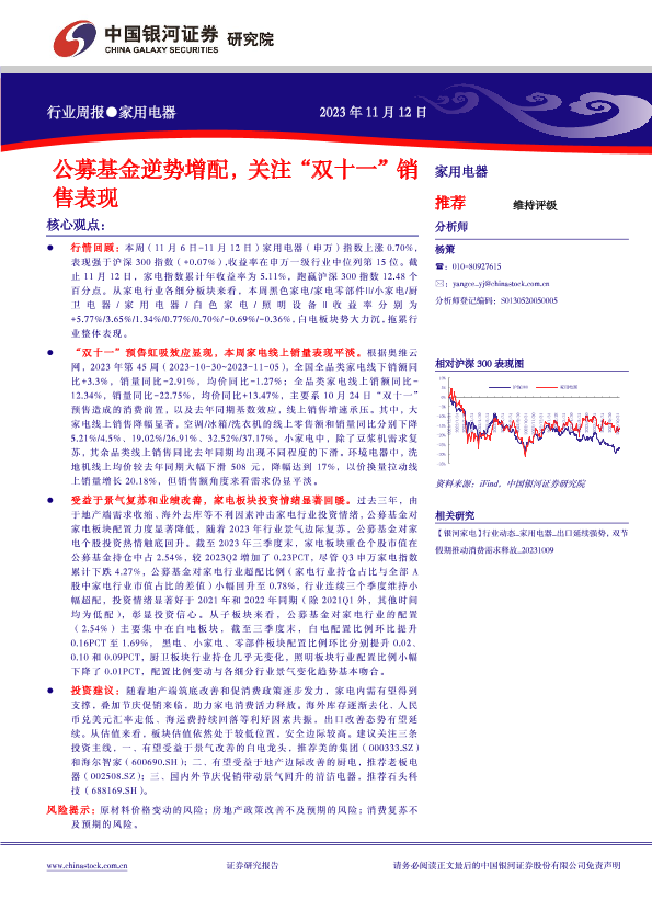 【银河证券】【20231112】家用电器行业周报:公募基金逆势增配,关注“双十一”销售表现-12页