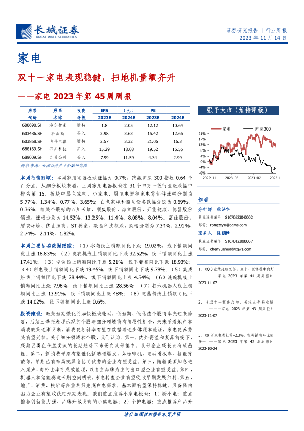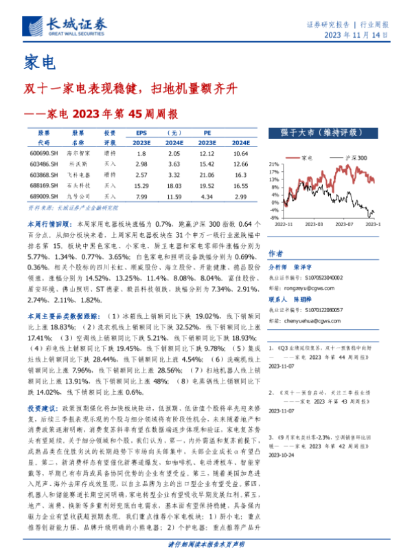 【长城证券】【20231114】家电2023年第45周周报:双十一家电表现稳健,扫地机量额齐升-28页