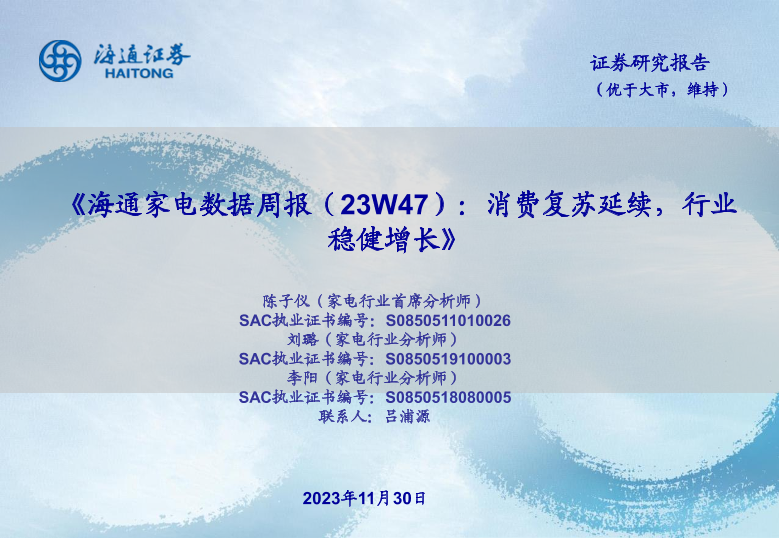 【海通证券】【20231130】海通家电数据周报(23W47):消费复苏延续,行业稳健增长-17页