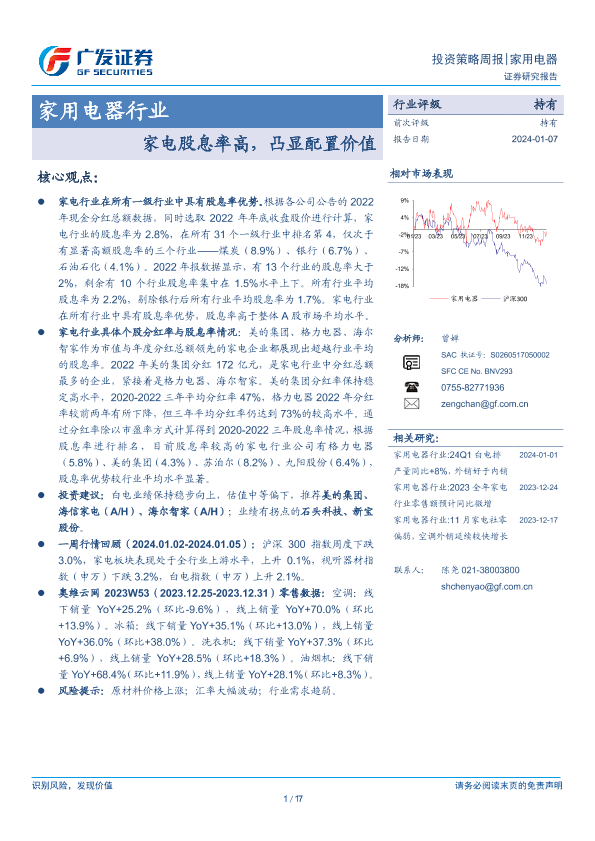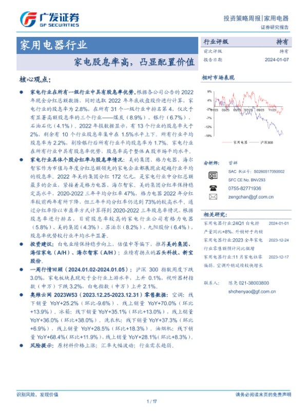 【广发证券】【20240107】20240107-广发证券-家用电器行业投资策略周报:家电股息率高,凸显配置价值-17页